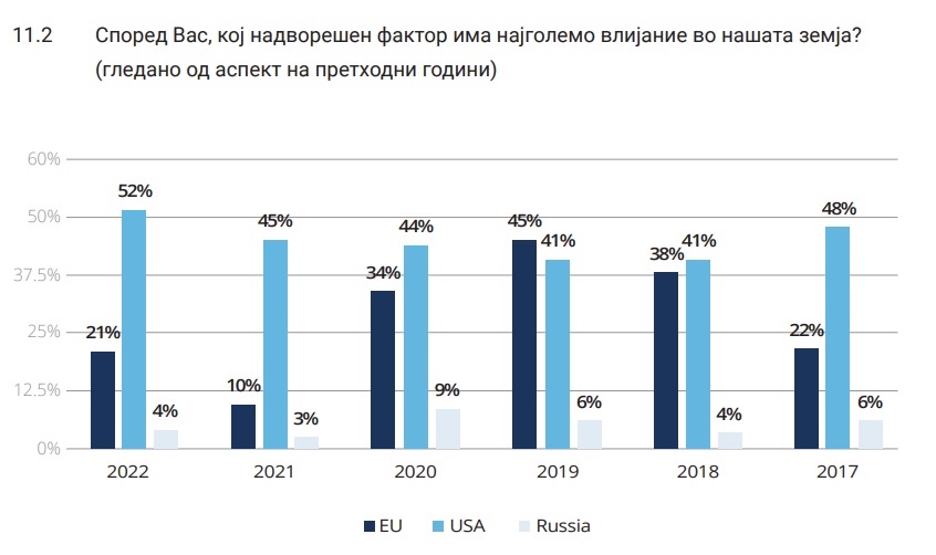 Едно од прашањата во анкетата било и „кој надворешен фактор има најголемо влијание во нашата земја“, на кое повеќе од половина (52 %) од испитаниците ги посочиле САД.