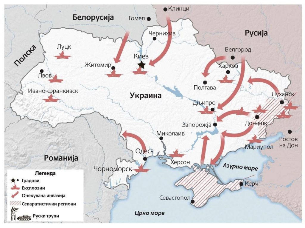 Според извештаите од теренот се проценува дека првата цел на Русија е да го освои главниот град на Украина со оклопни сили, каде се наоѓа и претседателот Володимир Зеленски, кој повеќе пати изјави дека нема да бега од Киев.