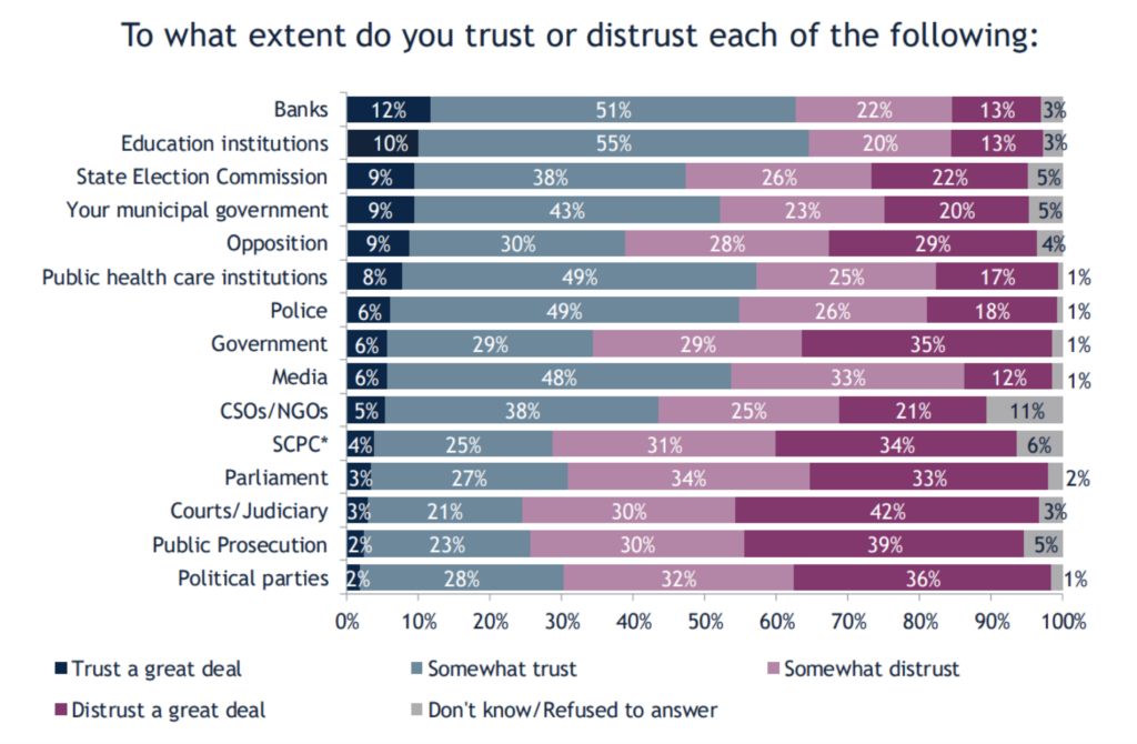 Значи „целосна доверба“ граѓаните најмногу имаат во банките – 12%, потоа во образовните институци – 10%, па во ДИК, во општините и во опозицијата – сите со по 9%, па следат јавните здравствени установи – 8%, па уште една група составена од полиција, влада и медиуми со 6%… а на дното се Собранието со 3%, правосудството со 3%, Јавното обвинителство со 2% и политичките партии со 2%.