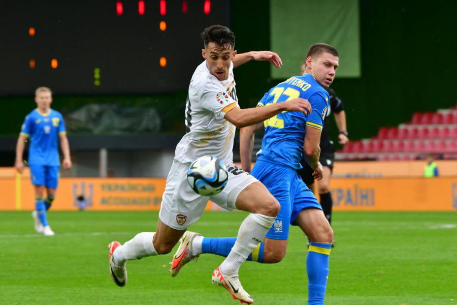 Македонската репрезентација резервирано го почна дуелот на „Епет Арена“ препуштајќи им ја иницијативата на украинските фудбалери, кои по шансите на Артем Довбјук и Михајло Мудрик, дојдоа во водство по половина час игра, кога ударот на Судаков се одби од телото на Серафимов и заврши во голот.