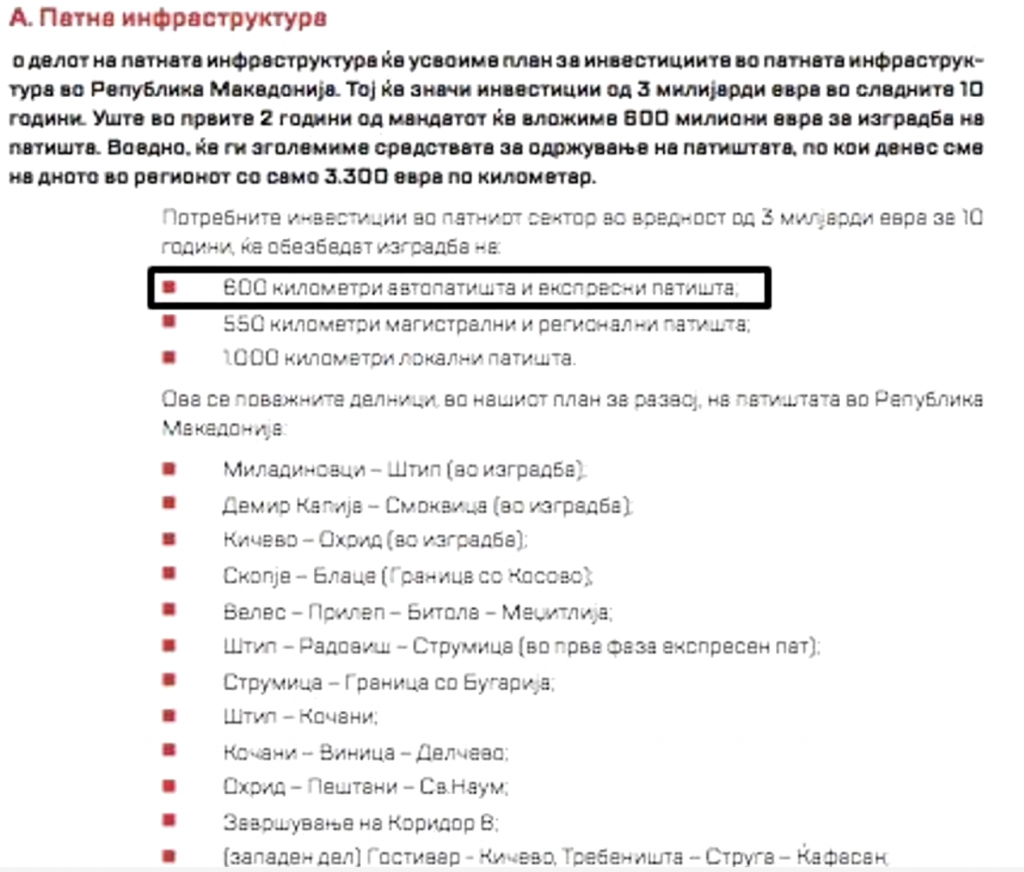 Власта на СДСМ во својата програма во 2016 година вети дека во Македонија ќе биле изградени 600 километри автопатишта, но и по пет години власт засега не видовме ниту еден нов километар