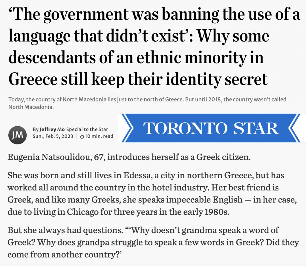 Канадскиот весник „Торонто стар“ во подолг напис насловен „’Владата забрануваше употреба на јазик што не постоеше’ Зошто некои потомци на етничко малцинство во Грција сè уште го чуваат својот идентитет во тајност“ се осврна на положбата на македонското малцинство кај јужниот сосед на Македонија.