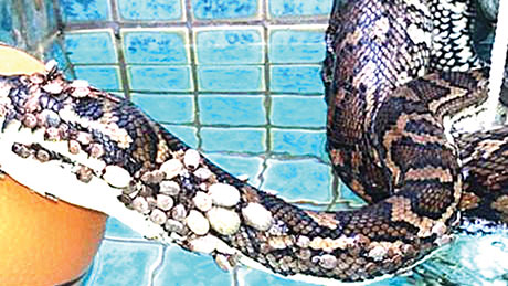 Спасувачи на змии во Квинсленд спасиле питон кој бил прекриен со стотици крлежи. Питонот кој бил многу болен бил фатен во базен во двор во Голд Кост.