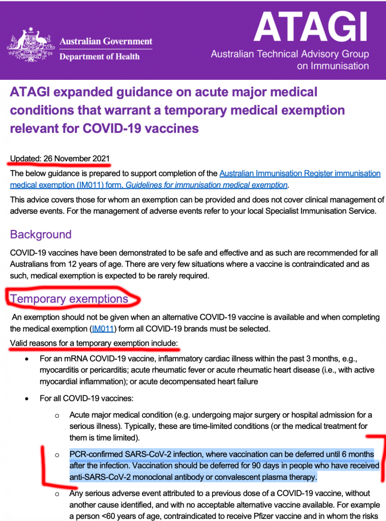 Австралиската техничка советодавна група за имунизација на 26 ноември 2021 има издадено документ во кој се наведени валидните причини за да не се прими вакцина.
