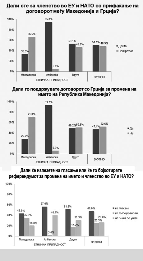 Етничката припадност во однос на тоа како ќе се гласа на референдумот закажан за 30 септември и натаму е многу изразена – мнозинството Македонци се против Договорот со Грција за промена на името, а кај Албанците тој процент и во однос на договорот и членството во НАТО и ЕУ е многу поубедлив, над 90 отсто.