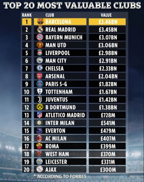 Каталонската гордост Барселона е највредниот клуб на светот, објави угледниот магазин „Форбс”, иако долговите на петкратниот европски првак и еден од најголемите клубови во светскиот фудбал надминува една милијарда евра.