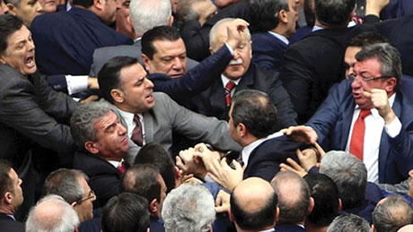 Во турскиот Парламент дојде до тепачка меѓу пратеници на владејачката Партија на правдата и развојот (АКП) и на опозициската Репбликанска народна партија (ЦХП), во текот на гласањето околу предложените уставни реформи со кои треба да се зајакне позицијата на претседателот Реџеп Тајип Ердоган.