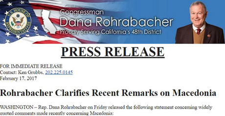 ВАШИНГТОН – Републиканскиот конгресмен на Калифорнија и претседавач на поткомитетот за Европа, Евроазија и опасности во пораст, Дана Рохрабакер, се сретна со претставници на ОМД по шо ја објави следната нова изјава во врска со неговата неодамнешна, контраверзна и широко цитирана изјава за Македонија: