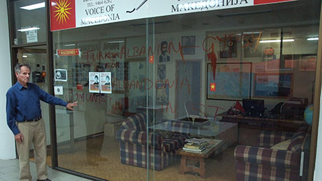 Минатиов викенд македонското 24 часовно радио “Гласот на Македонија”, што се емитува од Лајло, беше цел на вандалски чин. Како што дознаваме некаде во неделата попладне и рано наутро во понеделникот, излогот на канцеларијата каде е сместена оваа радио станица беше испишан со навредливи пароли.